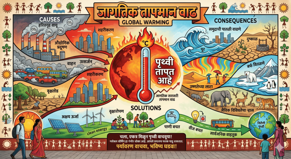 Global Warming Marathi Nibandh l जागतिक तापमान वाढ निबंध. जागतिक तापमान वाढ म्हणजे पृथ्वीच्या सरासरी तापमानात सतत होणारी वाढ. आजच्या आधुनिक युगात हा एक अत्यंत गंभीर आणि चिंताजनक विषय बनला आहे. औद्योगिकीकरण, शहरीकरण आणि वाढत्या लोकसंख्येमुळे पर्यावरणावर मोठा परिणाम झाला आहे.