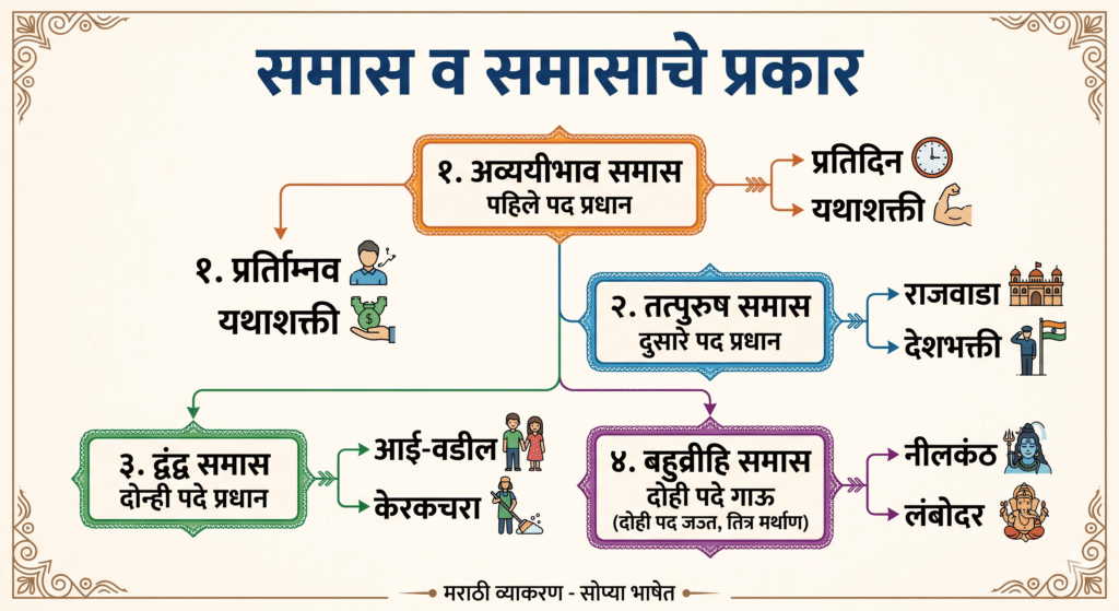 मराठी व्याकरणातील ‘समास’ हा घटक स्पर्धा परीक्षा आणि शालेय अभ्यासासाठी अत्यंत महत्त्वाचा आहे. शब्दांच्या एकत्रीकरणाला आपण ‘समास’ म्हणतो.